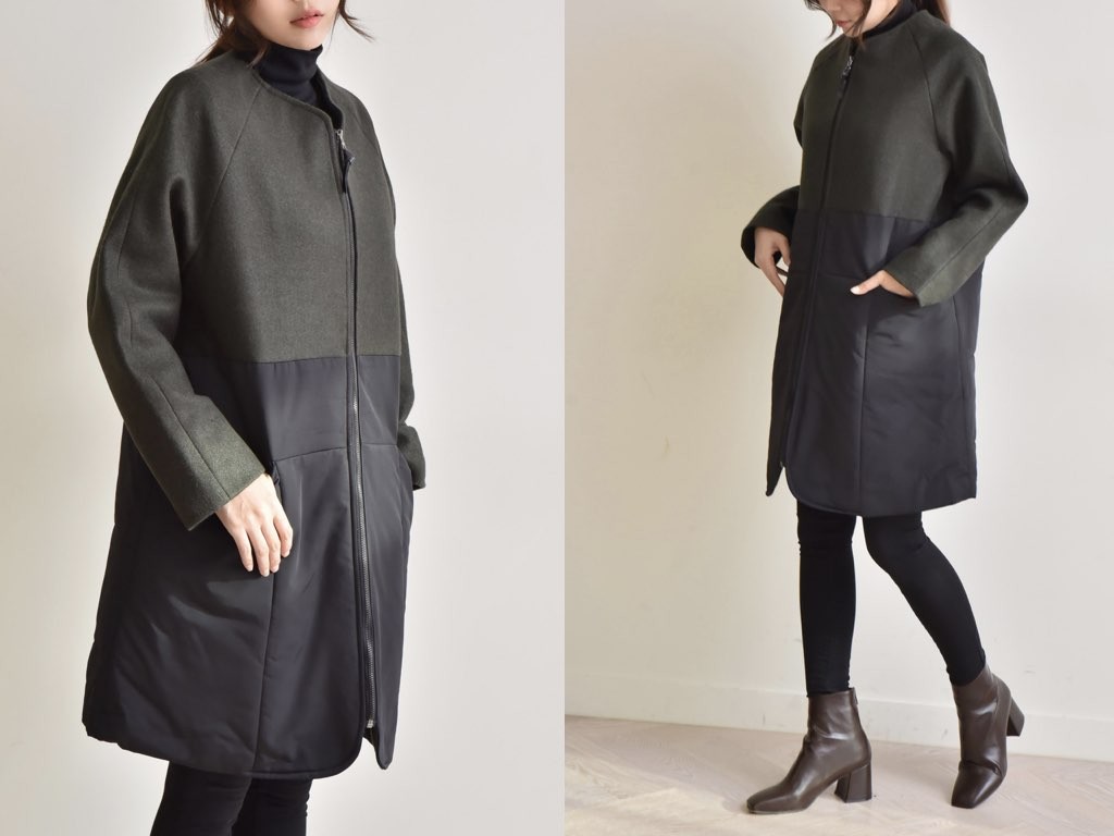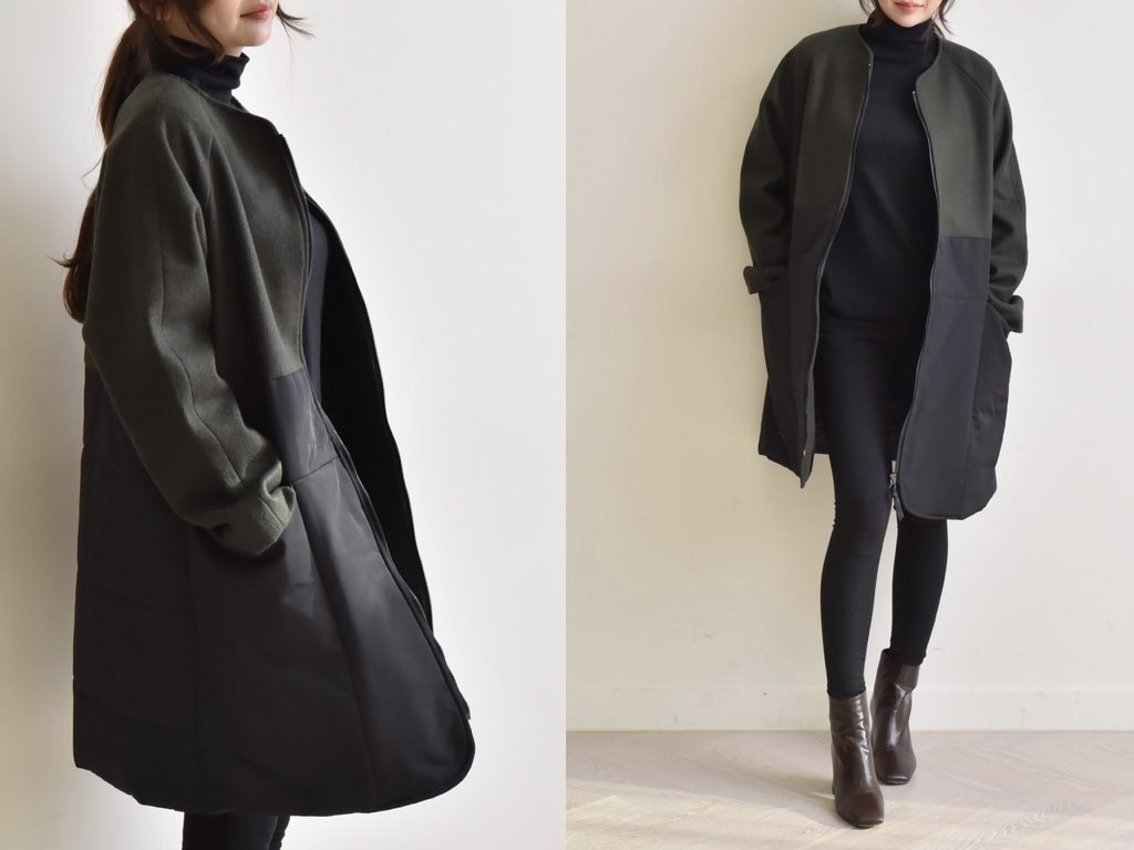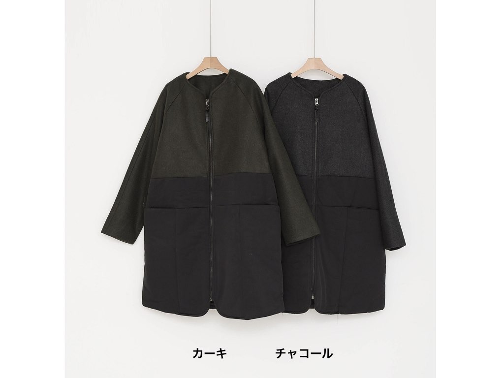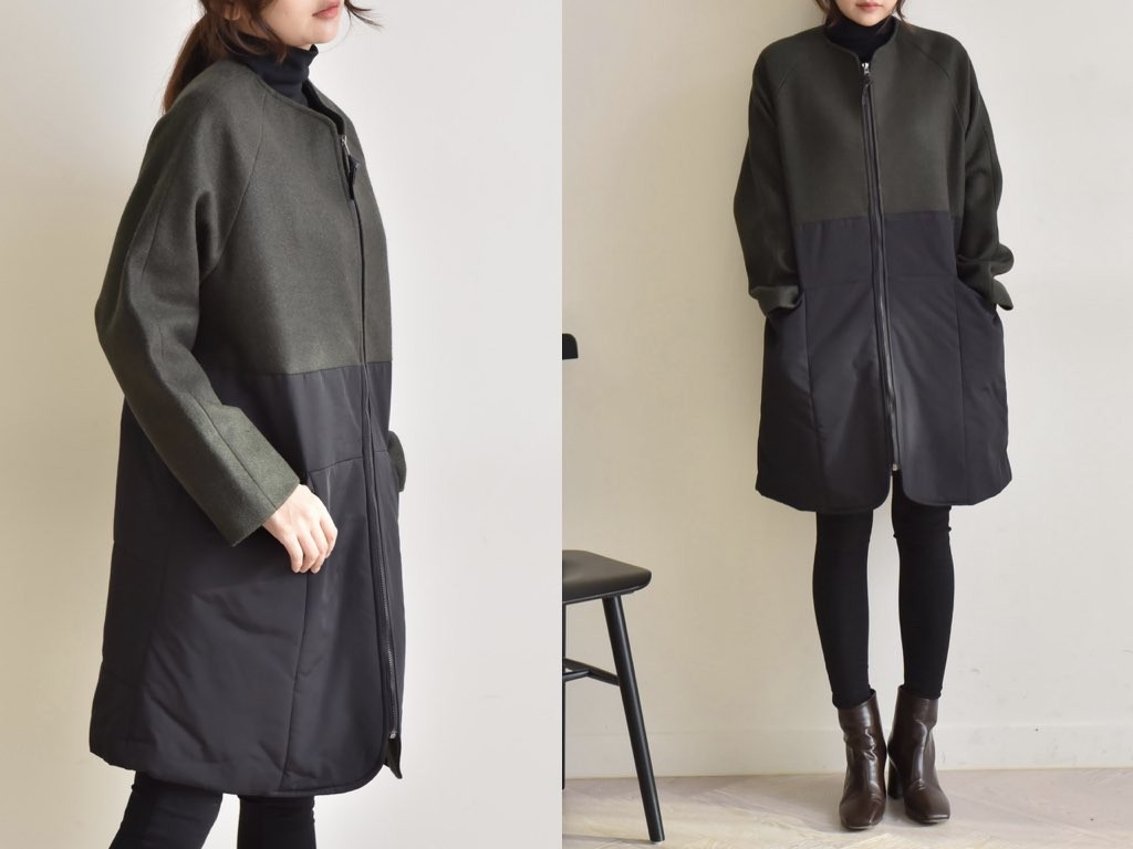 ウールのノーカラータイプのハーフコートです。襟が無いぶん、シンプルですっきりとした着こなしができる「ノーカラーアウター」。中に着るインナーのネックデザインとの組み合わせもいろいろと楽しめますね。1.基本情報色:2色展開(チャコール/カーキ)サイズ:Free素材:ウール70%、ポリエステル30%製造国:Korea2.サイズ情報肩幅:ナグランデザイン身幅(胸断面):57cm腕の長さ:71cm着丈(前):93cm(サイズは計る方法に応じて±2〜3cmの誤差があります。ご了承お願い致します)モデル着用サイズ:F※着用モデル(163cm、体重47kg、足のサイズ24.5cm)3.その他の情報厚み:中間透け感:なし伸縮性:なし裏地:有り(キルティング)洗濯方法:ドライ(クリーニング)[注意事項]お取り寄せ商品は、海外より仕入れるため納品まで約10日前後いただきます。また店舗でも販売しており、在庫切れになる場合もございます。ご了承お願い致します。