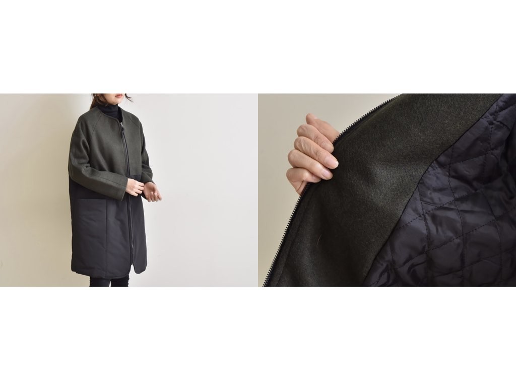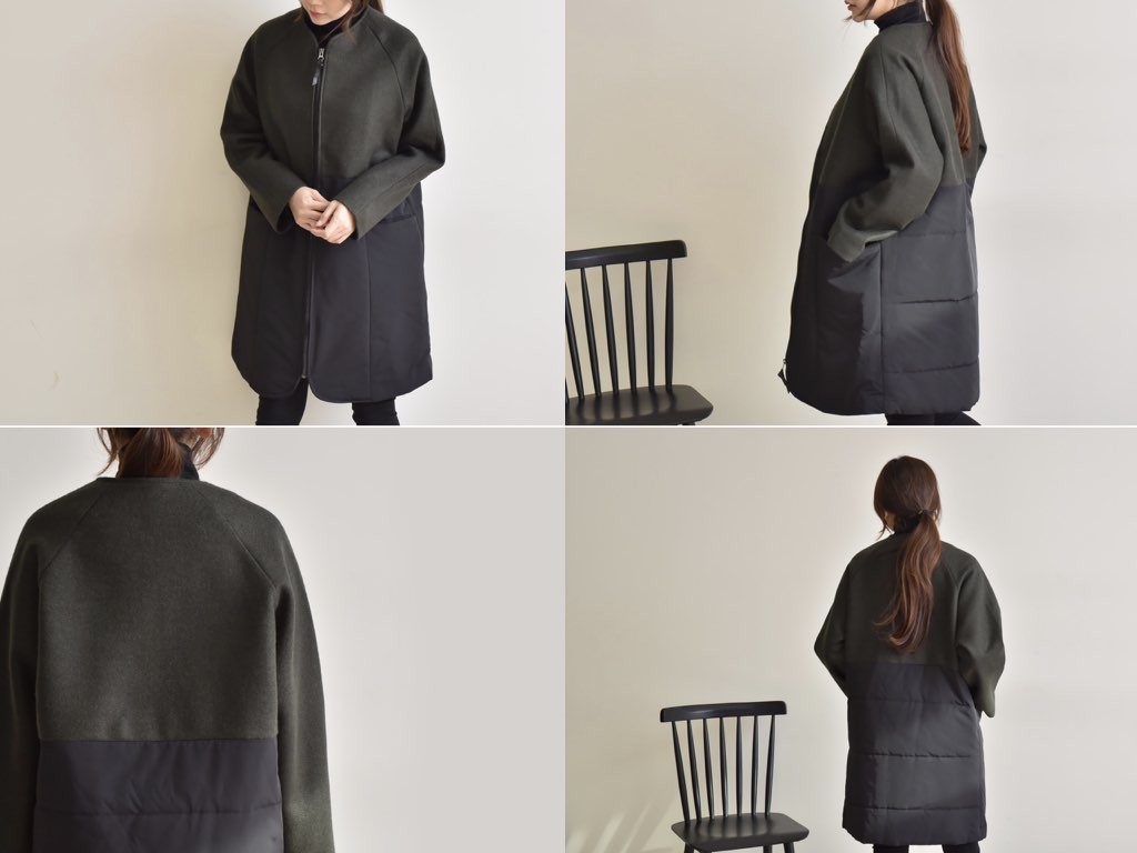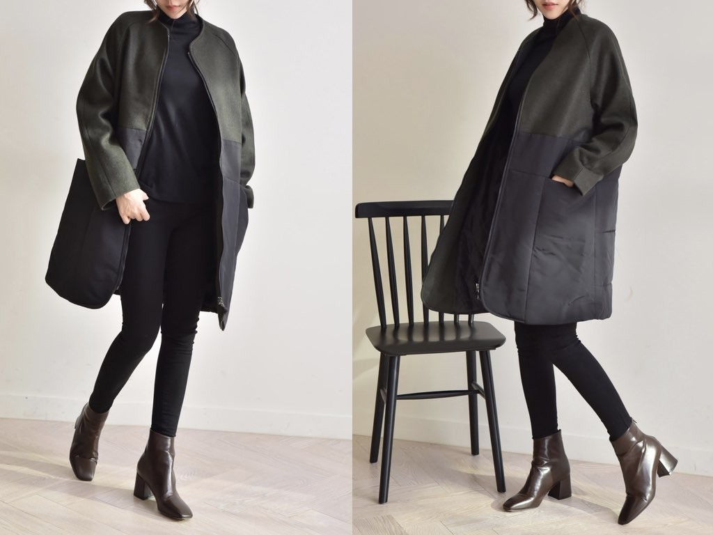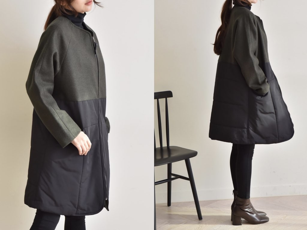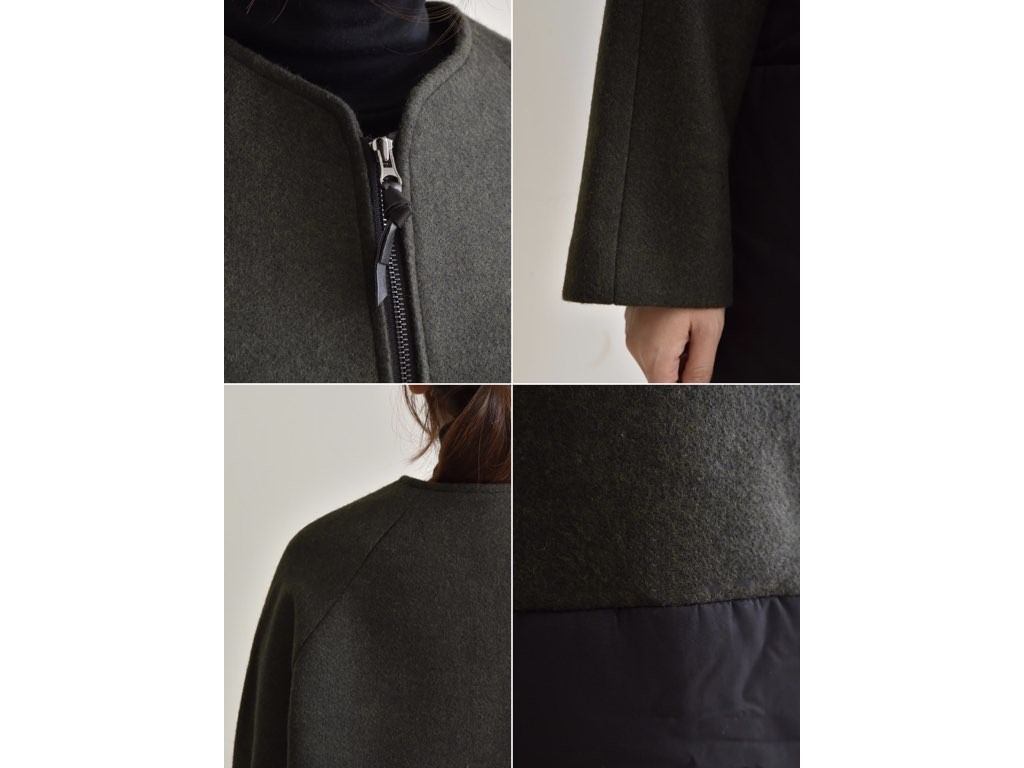 ウールのノーカラータイプのハーフコートです。襟が無いぶん、シンプルですっきりとした着こなしができる「ノーカラーアウター」。中に着るインナーのネックデザインとの組み合わせもいろいろと楽しめますね。1.基本情報色:2色展開(チャコール/カーキ)サイズ:Free素材:ウール70%、ポリエステル30%製造国:Korea2.サイズ情報肩幅:ナグランデザイン身幅(胸断面):57cm腕の長さ:71cm着丈(前):93cm(サイズは計る方法に応じて±2〜3cmの誤差があります。ご了承お願い致します)モデル着用サイズ:F※着用モデル(163cm、体重47kg、足のサイズ24.5cm)3.その他の情報厚み:中間透け感:なし伸縮性:なし裏地:有り(キルティング)洗濯方法:ドライ(クリーニング)[注意事項]お取り寄せ商品は、海外より仕入れるため納品まで約10日前後いただきます。また店舗でも販売しており、在庫切れになる場合もございます。ご了承お願い致します。