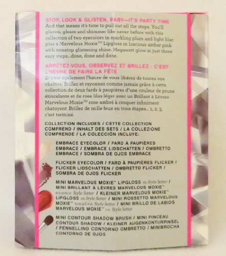 -. Feature : This Collection Includes: / Embrace Eyecolor (light lilac) (0.01 oz.) / Flicker Eyecolor (sparkling plum) (0.01 oz.) / Mini Marvelous MoxieTM Lipgloss in Style Setter (amber pink) (0.07 fl. oz.) / Mini Contour Shadow Brush