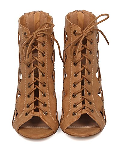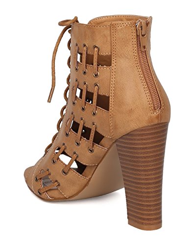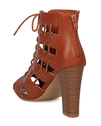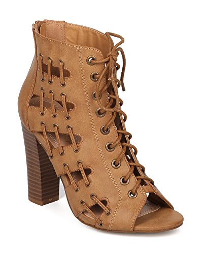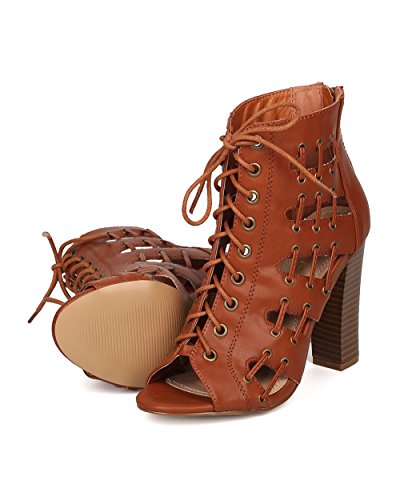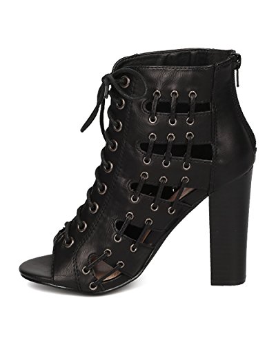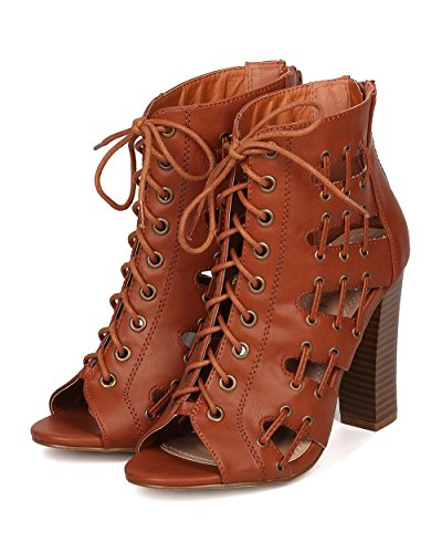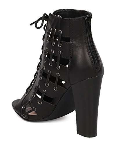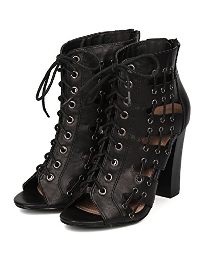 Product Description These sexy booties are made with a leatherette upper, peep toe and lace up front. Also features sexy side cut out details, block heel and hind zip for easy slip on and off. 0