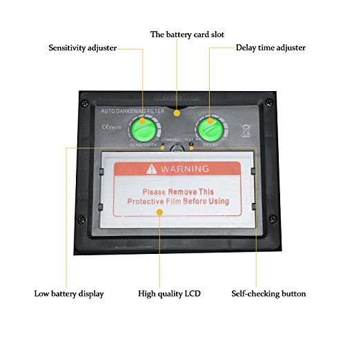 - Built-in LCD darkening filter, large viewing size 3.66”*1.69” with a DIN 9~13 shade,ultraviolet (UV) and infrared (IR) coated, with active/inactive shade setting, protect eyes from harmful rays.