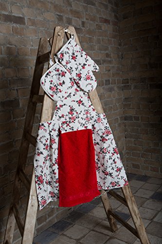 - SUPERIOR QUALITY – All the 5 kitchen accessories included in the set are made up of 100% cotton which is considered ideal for a wide range of needs – when used in kitchen towels it ensures ultra-high absorption which is the most desirable characteristic of kitchen towels, in mitt & pot holder set it ensures comfort, convenience & a natural feel in addition to protection, and in apron it gets credit for high breathability, ease of clean, comfort, style & elegance!