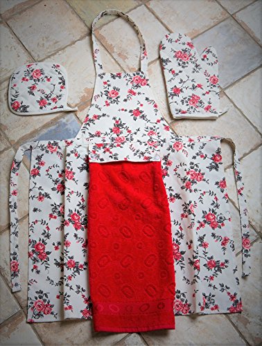 - A COMPLETE SET – This color coordinated set is an all-in-one package which helps protect your clothing from spills & stains while allowing your hands from burning during barbecuing, general cooking or baking (oven mitt & pot holder), and help mop the mess up, quickly dry the cleaned plates, pots or pans, or wipe clean your greasy or wet fingers.
