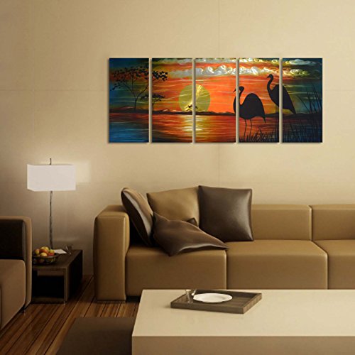 Egret in Lake before Sunrise Modern Metal Wall Art 5 Panels Handmade Large Landscape Painting
