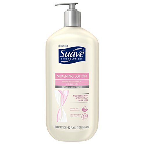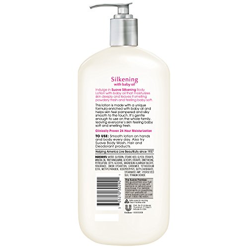 Clinically Proven to moisturize as well as Crabtree & Evelyn Jojoba Oil Moisturising Body Lotion Our Suave Skin Solutions Silkening Body Lotion with baby oil moisturizes skin deeply and leaves it smelling powdery fresh and feeling soft. This lotion is enriched with baby oil and helps skin feel pampered and silky smooth to the touch. It's gentle enough to use on the whole family, leaving everyone's skin feeling soft and smelling fresh. HOW TO USE For soft, powdery fresh skin, apply a generous amount with fingertips, and massage in gently with a soothing, circular motion. There's a Suave for every skin need. Suave Solutions Body Lotions is designed to moisturize as well as premium skin care variants and provide 24 hour moisturization benefits. See each pack for more details. Choose from our wide range of moisturizing lotions that best caters to your skin care needs : Advanced Theapy for severely dry skin, Smoothing with Cocoa Butter and Shea, Soothing with Aloe, revitalizing with Vitamin E and Silkening with Baby Oil. Enjoy beautiful soft skin every day with Suave. Also try other Suave products such as deodorant, body wash and hair care. What's in the Box Suave Skin Solutions Silkening with Baby Oil Body Lotion, 32 Fluid Ounces.Feature