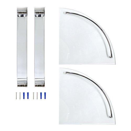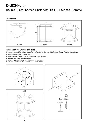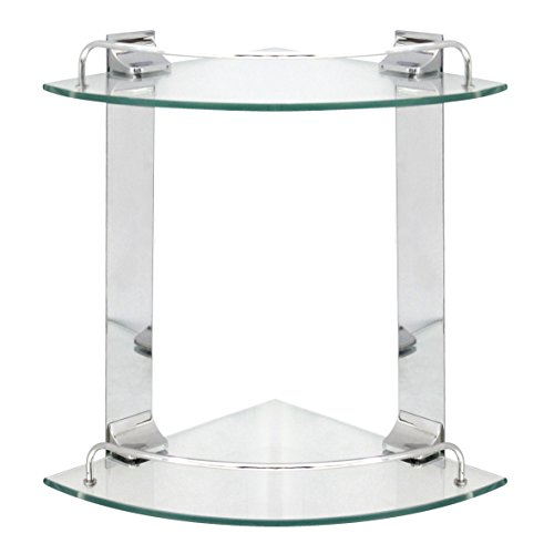 Double Corner Glass Shelf with Rail. Size = 9½” x 9½” x 13½”. Ideal for use in Shower to Hold Liquid Soap, Shampoo, and Conditioner Bottles. Rails keeps all Contents Safe and Secure.