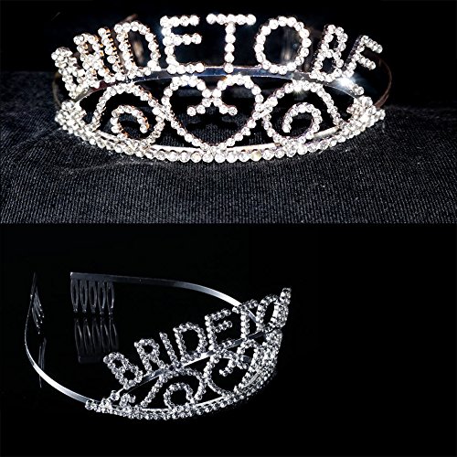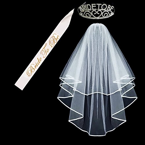 1 x Glitter?Rhinestone Bride to Be Tiara 1 x White Double Ribbon Edge Center Cascade Bridal Wedding Veil with Comb 1 x Gold stamp bride to be letters?Satin Sash