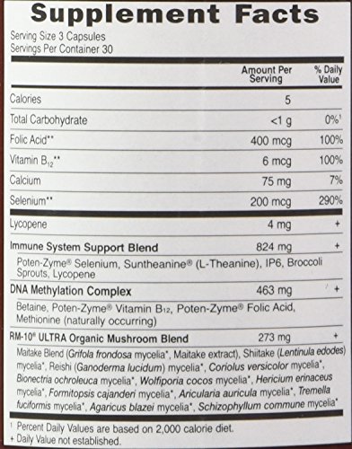 -. Feature : The ultimate immune health formula, containing organic mushrooms and other specially selected nutrients to provide broad spectrum immune support via multiple pathways: immune cell function support, immune cell metabolism support, methylation support and antioxidant support / Contains a proprietary blend of organically-grown, tonic mushrooms, L-theanine, selenium, lycopene and other ingredients that promote healthy immune system function. / Select ingredients are produced through the Garden of Life proprietary Poten-Zyme process to make nutrients more available to the body / Delivered via UltraZorbe 100% vegetarian capsules to ensure potency, eliminate the need for fillers and binders, and provide quick nutrient release through faster dissolution into the body (independent study suggests UltraZorbe capsules dissolve more completely than other vegetarian capsules)