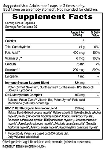 RM-10 ultra is the ultimate immune health formula, containing a proprietary blend of organically-grown, tonic mushrooms, l-thiamine, selenium, lycopene and other ingredients that promote healthy immune system function. It provides broad spectrum immune system support via multiple pathways immune cell function support, immune cell metabolism support, methylation support and antioxidant support.