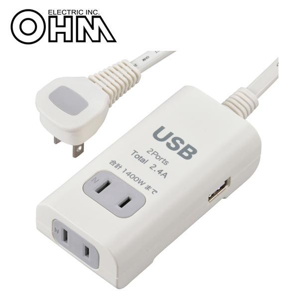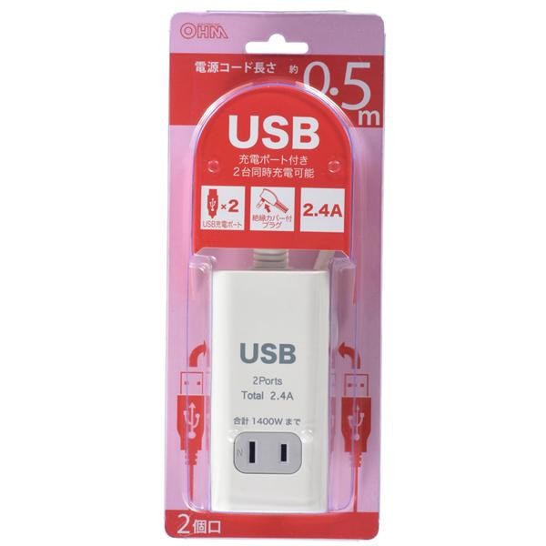コンセントとUSB充電ポートがそれぞれ2個口ずつ付いた電源タップです。パソコン周辺機器やAV機器などを2台同時に充電できます。 製造国:中国 ※サプライヤー直送品 ご注文後2~3営業日後の出荷となります【商品名】オーム電機 OHM 電源タップ USB充電ポート付き 2個口 0.5m HS-T205U2-W