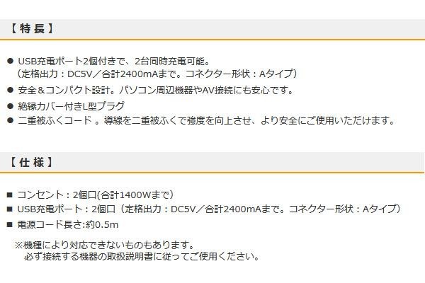 コンセントとUSB充電ポートがそれぞれ2個口ずつ付いた電源タップです。パソコン周辺機器やAV機器などを2台同時に充電できます。