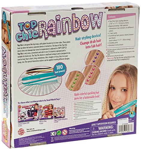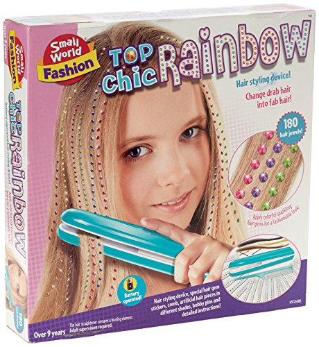 Battery-operated hair styling device - Makes your hair glow with sparkling colors! Change drab hair into fab hair! Multi-colored, dazzling hair jewels! Suitable for natural hair and for synthetic hair pieces! 180 sparkling hair jewels! Hair styling device, special hair gem stickers, comb, and artificial hair pieces in different color shades, hair pins and detailed operating instructions! Closed box: 113/4"W x 21/2"D x 113/4"H. Over 9 years. 2-AA batteries required. Not included.Feature