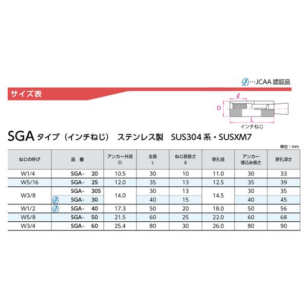 ●ねじの呼び:W1/2 全長:50mm ねじ部長さ:20mm 穿孔径:18mm アンカー 埋込み長さ:50mm 穿孔深さ:56mm アンカー外径:17.3mm