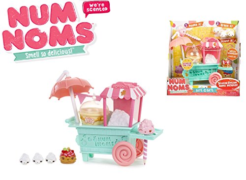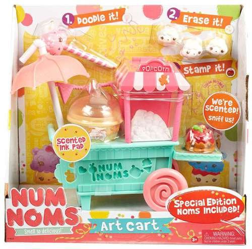 Feature : Express your creativity with the Num Noms Art Cart! Doodle it! Erase it! Stamp it! / Stationery is scented for tons of delicious fun! / It includes four scented eraser Noms and one scented stamper Nom. / Special Edition Noms: Cotton Candy Eraser, Pip, Pup and Pop Corn Erasers and Caramel Apple Stamp-It / Cotton candy scented ink pad. Noms erase pencil drawings. Hidden Num Noms ruler and stencil on the cart. Includes collector's menu