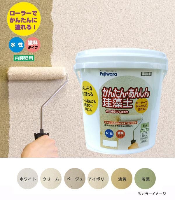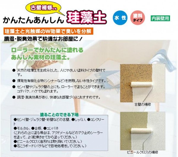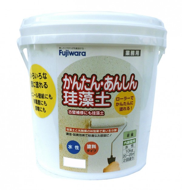 | 天然の珪藻土を主成分とした、人にやさしい塗料タイプの壁材で、揮発性有機化合物(シンナーなど)を使用しない水性タイプです。センイ壁やジュラク壁の上にもローラーで塗ることができます。コテバケ・ハケでも塗れます。調湿・脱臭効果があり、快適なお部屋づくりにおすすめです。6畳間がほとんど塗れるお徳用です。別売りの下地処理剤「アクドメール」をご使用いただければ、より綺麗な仕上がりになります。 |