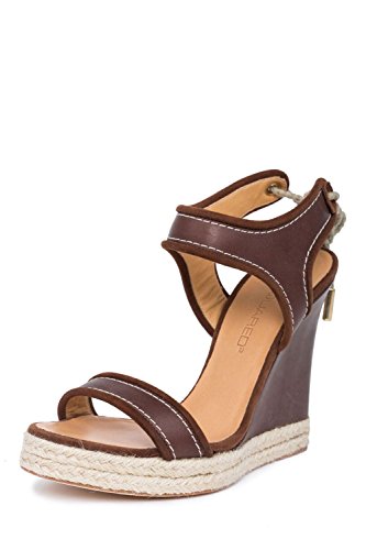 DSQUARED2 combines a classic strappy design with rope closure for a go-to, stylish look. Brown leather straps and suede trim form an undeniable sexy silhouette, heightened by a rope platform and leather covered wedge. Leather lining and sole. Made in Italy