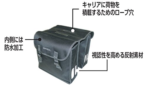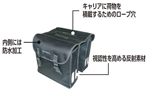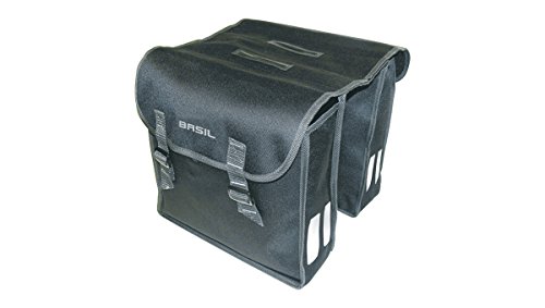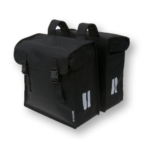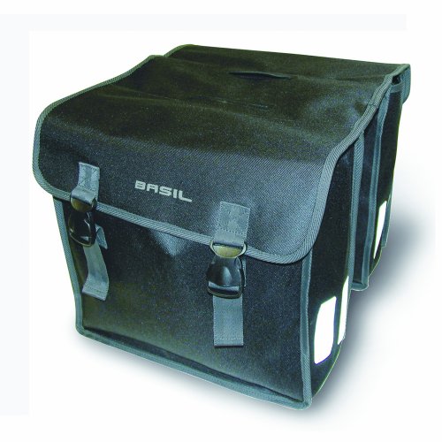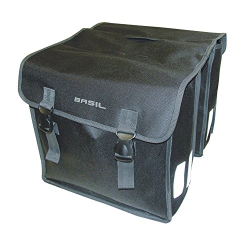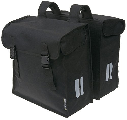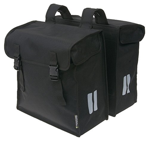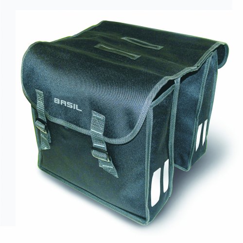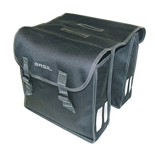 - This Basil double pannier bag is made from 600D polyester foldable material with a 47 litre capacity for plenty of storage complete with buckle closures. Includes double reflective stripes on front and back for greater visibility and safety.