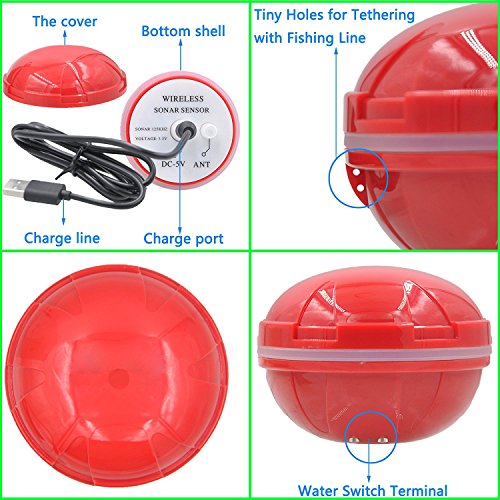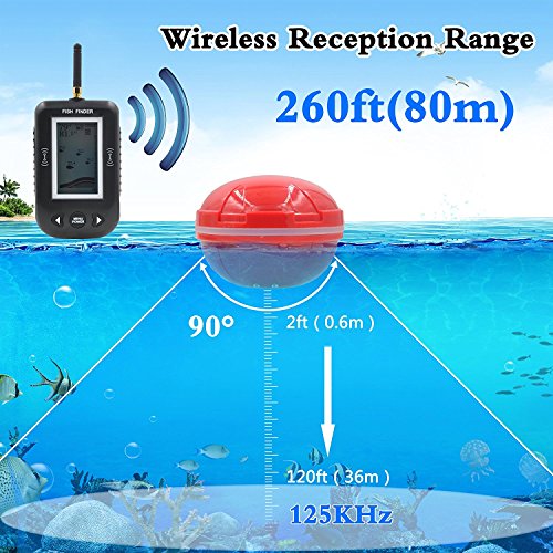 - [Wireless and Portable] - Just simply tether your fishing thread via 2 small holes on the side of sensor then cast it into the water. The sensor will switch on automatically when two pins terminals at the bottom touch water, then send results back to the receiving mainframe. 2.4GHZ operational Radio Frequency guarantees wireless sonar operational distance at max. 260FT/80M.