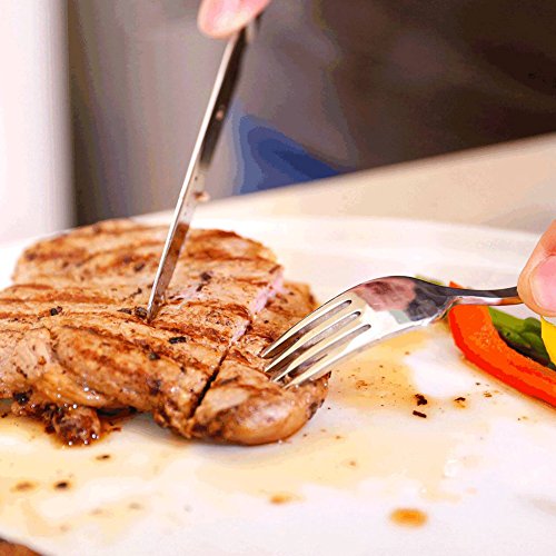 -4 x Steak Knife: used for eating cooked meat, pizza, cake, etc. -4 x Dinner Fork: used for eating pasta, noodles, sliced fruits, etc. -4 x Salad Fork: used for eating sliced fruits, desserts,salad, etc. -4 x Dinner Spoon: used for eating rice, soup, gruel, etc. -4 x Dessert Spoon: used for eating ice cream, dessert or drinking.