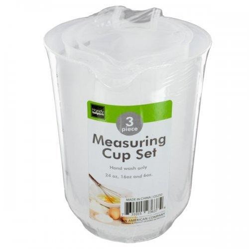 Studio : Kole Imports Publisher : Kole Imports Binding : Kitchen Product Description Easily measure dry and liquid ingredients with this 3-piece plastic measuring cup set featuring durable transparent plastic Cups with pour spouts and handles. Cups have measuring mark lines for Cups, ounces and milliliters. Includes 24, 16, and 6-ounce Cups. Comes SHRINK wrapped. 0