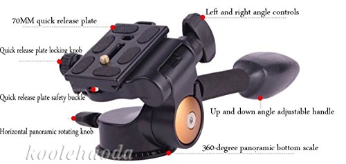 The tripod head support 360 degrees horizontally moving and 180 degrees vertically moving.Max Load up to 12kg.