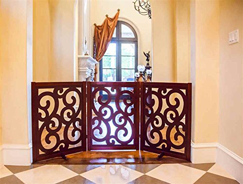 - Feature : Dimensions: 81.5L x 12.6W x 35H in. / Usable in doorways up to 81.5 inches / Three hinged freestanding panels with support feet for stability and rubber pads to prevent sliding / Wood construction in classic walnut finish / Scrollwork design matches any home decor