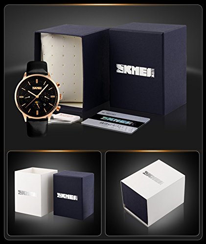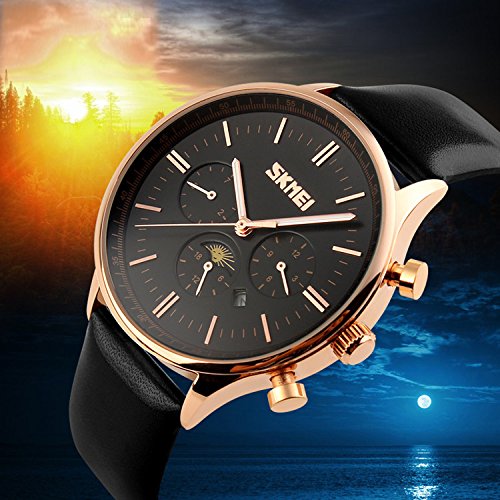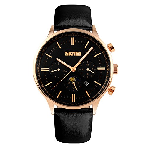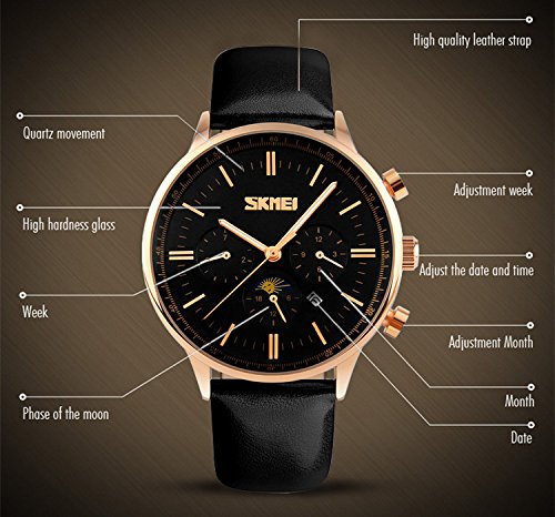 -. Title : Mens Unique Casual Analog Classic Quartz Watch Business Leather Band Waterproof Stainless Steel Case, Qual Dial Month, Week, Date, Moon Phase Black