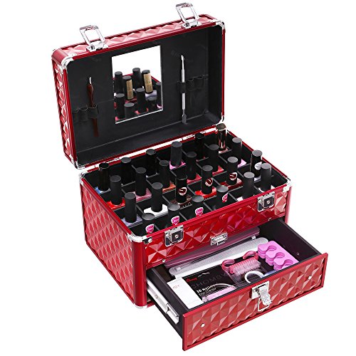 SONGMICS 24 Compartments Nail Polish ( not included ) Organizer Makeup Train Case with Mirror Portable Cosmetic Storage Holder with 1 Drawer Red UMUC18R