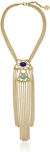 Bohemian style necklace featuring gold-tone chain and labyrinthine design pendant with flowing tassels evoking iconic journeys and cool breeze climate of Venice.