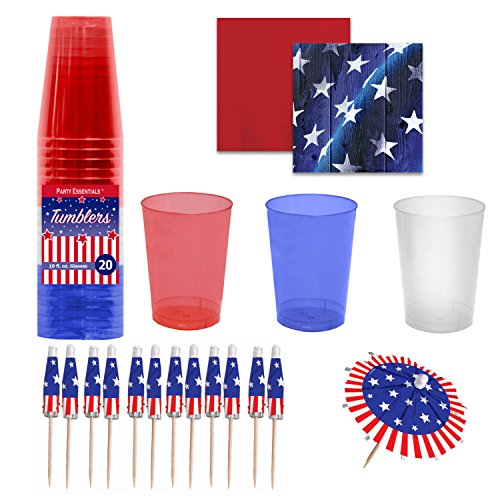 Fourth of July Patriotic Party Supply Set - Red, White Blue Premium Plastic Cups with Coordin...