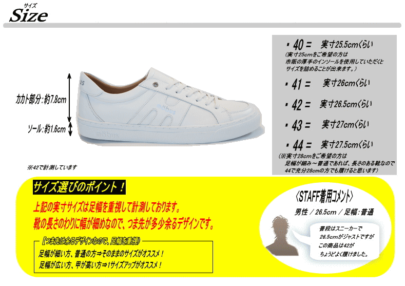 | サイズ | 作り⇒幅細め 【サイズ選びのポイント!】 足幅が細い方、普通の方⇒そのままのサイズがオススメ! 足幅が広い方、甲が高い方⇒1サイズアップがオススメ! |