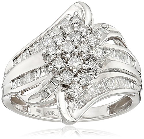 -. Feature : Combination of Baguettes and Round Diamonds Center Cluster Ring in 10k white gold - 1 cttw