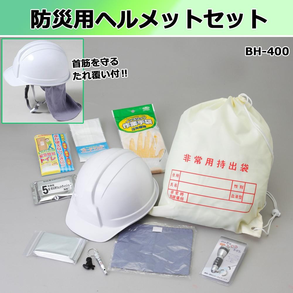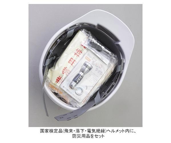 国家検定合格品(飛来・落下・電気絶縁)ヘルメット内に、防災用品をセットしました。場所をとらず、持ち運びに大変便利です!!ヘルメットは日本製で軽くて丈夫なアメリカン型です。首筋を守る着脱可能なたれ覆いも付いています。たれ覆いは自己消火性布地を使用しています。 |
