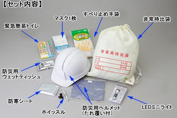 | セット内容 | 防災用ヘルメット(たれ覆い付)、防寒シート、LEDミニライト(ボタン電池LR41×4個入※テスト電池)、ホイッスル、防災用ウェットティッシュ20枚、すべり止め手袋、緊急簡易トイレ(1回分)、マスク1枚、非常持出袋 |