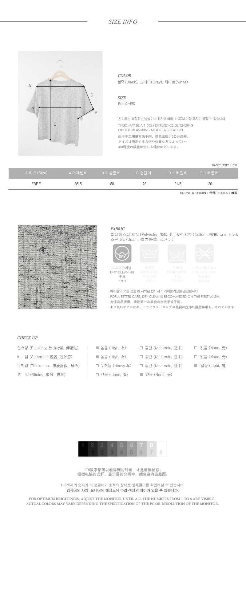 코디 걱정없이 이지한 레이어드룩을 완성해 줄 크롭 티셔츠에요!니트 느낌의 터치감이 세련된 아이템이구요,군더더기없는 심플한 디자인과 크롭으로쪽 떨어지는 일자핏이 유니크해요^^은은한 비침으로 시스루 느낌을 연출하면서신축성이 좋아 활동감도 편하구요,코디하기 좋고 스타일까지 있는 아이템으로컬러별 소장도 추천한답니다~