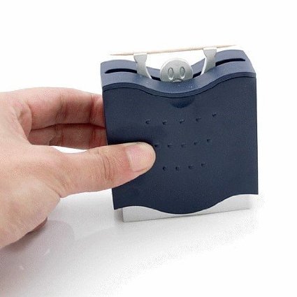 - A little man holds up a clean toothpick in his outstretched arms every time you lift and drop the cover.