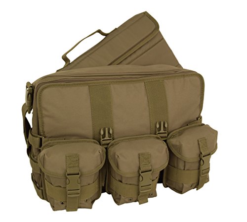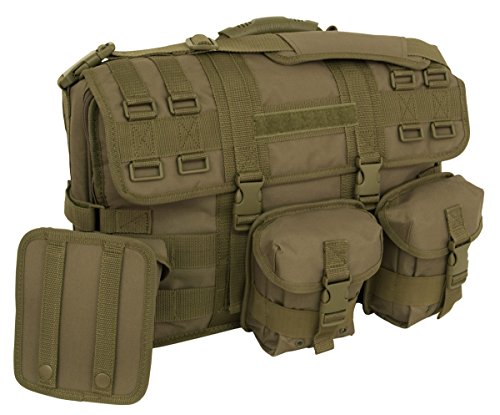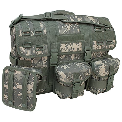 -. Feature : 600 Denier polyester construction, PVC lined interior (water resistant), and nylon lined main compartment and flap / MOLLE loops with multiple attachment points and three removable MOLLE accessory pouches / File and organizer pocket with dual zippers; Padded main compartment with dual zippers / Removable padded computer case with handle accommodating most laptops up to 17" / Expandable Main Compartment