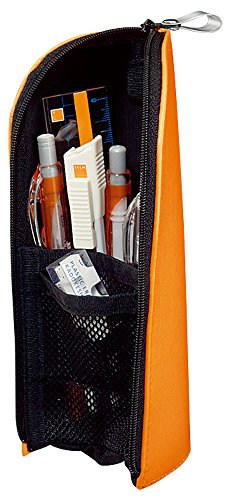Pen case that can be used to stand like a pen stand. It is with a pocket within which can accommodate the eraser and accessories.