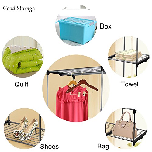 SPACIOUS STORAGE CLOSET - 2 Movable clothes hanging rod and 9 storage shelves offers you extra space both for your longer outfits and folded clothes.