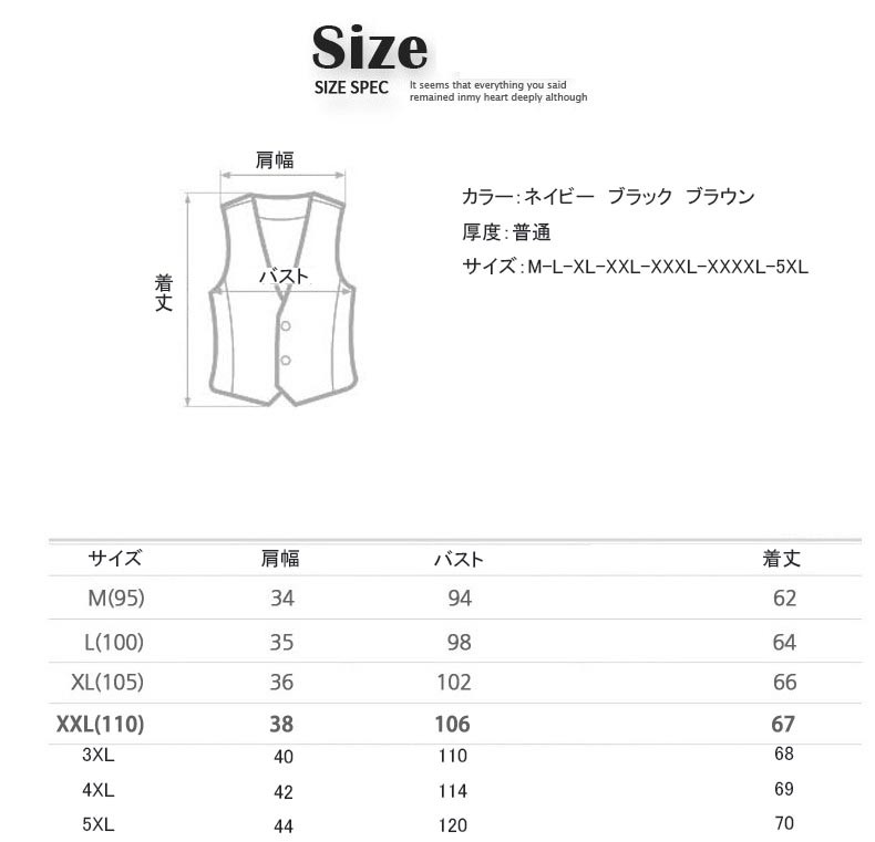 サイズ バスト 肩幅 着丈M 94 34 62L 98 35 64XL 102 36 66XXL 106 38 673XL 110 40 684XL 114 42 695XL 120 44 70