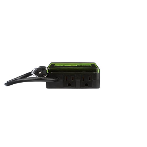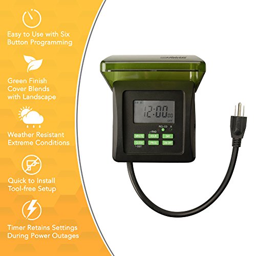- WEATHERPROOF DIGITAL TIMER OUTLET SWITCH: this electrical outlet with digital timer has a hardy body and heavy-duty timer cover to protect it from the weather, dust and dirt