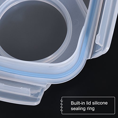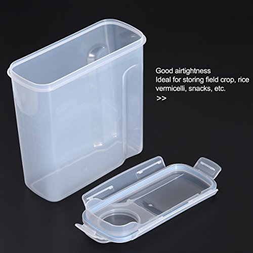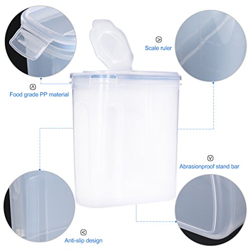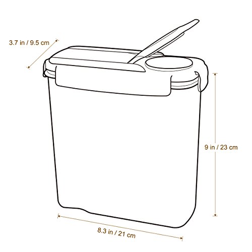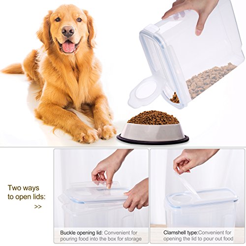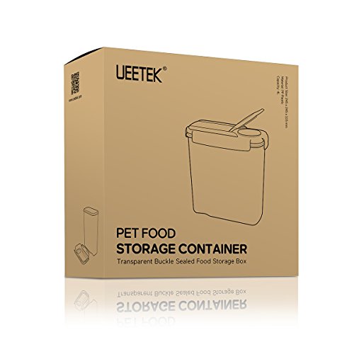- Brand: UEETEK. - Color: Transparency. - Material: PP. - Size: Approx. 24 x 9.5 x 23cm/ 9.45 x 3.74 x 9.1 inch (LxWxH). - Capacity: 4L. - Translucent design with a graduated scale allows for easy monitoring of food amount and controlling of your dog's appetite. - Two ways to open lids. Clamshell type: easy to open the lid and pour out the food; buckle opening lid type: easy to pour the dog food into the box for storage. - With airtight seal rings and seal buckles keep out moisture, humidit, keep the food dry and fresh. - Sealing performance is very good to prevent the entry of insects and dust. - Easy to clean, perfect for indoor, outdoor and traveling.