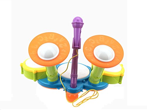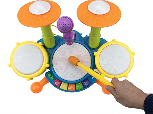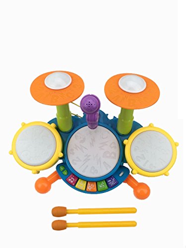 Kids learning toy has three drum pads and cymbal each with its own unique sound for sensory development.Great gift!