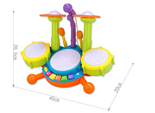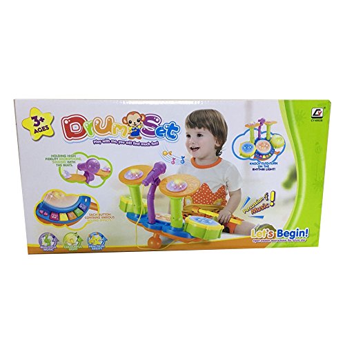 Kids drum set has 4 modes of play. Flashing Lights.