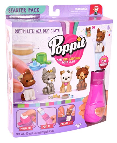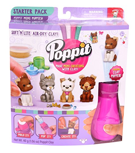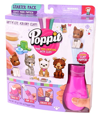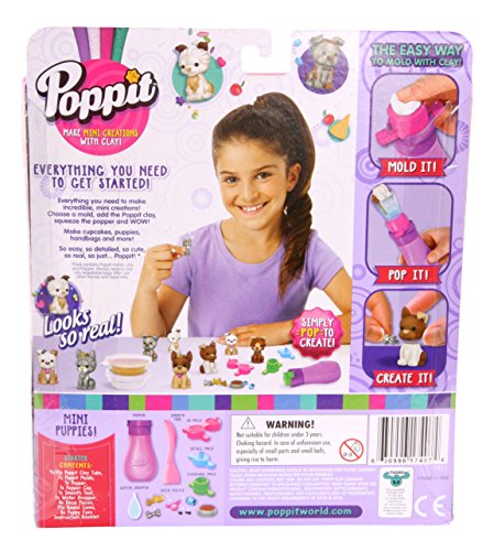 Create with clay the Poppit way! Make a miniature world that looks so real with Poppit! Load the Popper with clay, pop out your piece and make cute mini creations! It’s the fun easy way to create with clay! Create mini cakes, cool accessories, cute puppies and all sorts of small stuff! There are lots to pop in this mini world! The Poppit Starter Pack comes with four different coloured clays and seven different Poppit molds, a Poppit popper, Poppit Tool, Dropper as well as lots of pieces to decorate plus sprinkles, beads and gems as well so that you are ready to create some mini magic! There are 3 great themes to choose from. Pop out Mini Designer Handbags, Mini Puppies or Mini Cupcakes. They are Mini Creations, Made Easy!Feature
