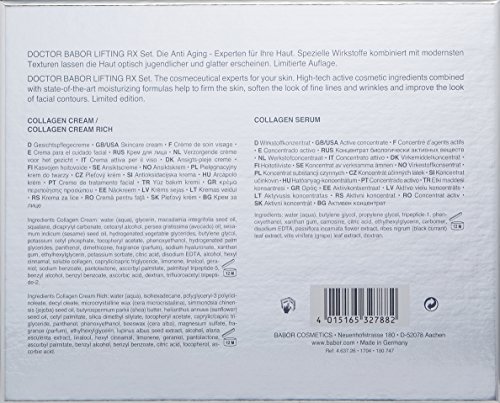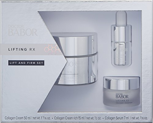 The LIFTING RX SET contains three specialists of the DOCTOR BABOR Lifting RX Precision Line with a focus on collagen: Collagen Cream 50 ml, Collagen Infusion 7ml and Collagen Booster Cream Rich 15 ml sample size. The experts ensure an improved appearance of the skin. For a smoother and more tapered complexion. Special ingredients combined with modern textures make the skin look youthful and smoother. For perfect results: Collagen Infusion 7ml - active ingredient concentrate as an intensive cure. In sample size. Collagen Cream 50 ml - Face Care Cream. NEW! Collagen Cream Rich 15 ml - Extremely rich, & firming face care cream, also ideal as a night cream. In sample size. Collagen Infusion in 7 ml: The active substance concentrate serves to improve the skin's firmness. Specially selected active ingredients such as Tripeptide-1 solution, the plant complex ECM-Protect and the anti-glycation active substance Carnosine support the extracellular matrix. Wrinkles and weakness of the fabric are alleviated and the skin image is improved noticeably. For a smoother and youthful looking complexion. Collagen Cream in 50 ml: The hyaluronic acid complex and marine collagen of the collagen cream provide the skin with intensive moisture. At the same time, the tripeptide leaves the skin appearing smoother and activates the high collagen production. The complexion appears plump and fresh. NEW! Collagen Cream Rich in 15 ml: This particularly rich Collagen Cream Rich counteracts the skin's tenderness, reduces the depth of wrinkles and supports the skin barrier. The brown algae extract stimulates the complex collagen and hyaluronic acid synthesis and the contained Lupines Complex improves the firmness of the skin. The skin protection barrier is also supported with omega fatty acids. The complexion appears smoother and youthful fresh.