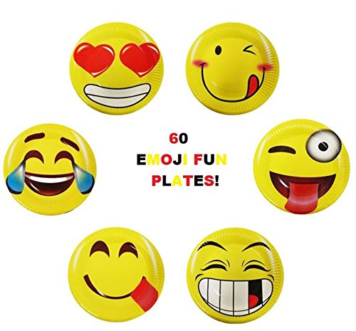 60 Emoji Party Paper Plates 7 Inch Emoji Fun Party Supplies and Party Favors. Pack of 60 Yellow Emoji Themed Smile Faced Dessert Plates.
