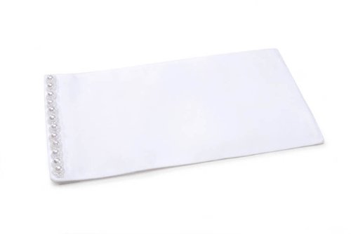 This beautiful white satin bouquet wrap by Victoria Lynn has pearl trim and a hidden hook and loop tape enclosure. Wraps around stems for an easy way to carry your bridal bouquet.