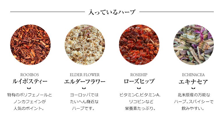 【原材料】オーガニック・ルイボスティー、オーガニック・エキナセア、オーガニック・ローズヒップ、オーガニック・エルダーフラワー