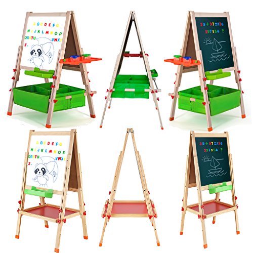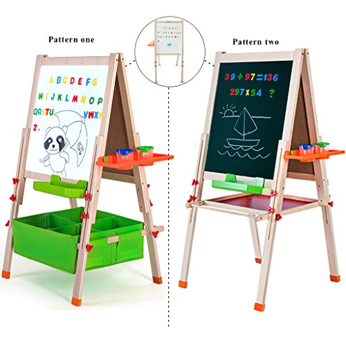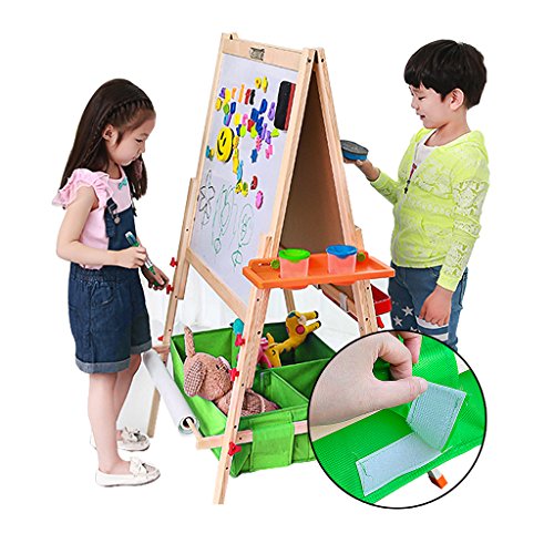 Features two different storage patterns for you to choose?a canvas storage bin or tray. You can choose your own storage space. Adjustable Height Easel has an adjustable height in the range of 35.4" to 61.4".Adjustable legs allow you to change the height to suit for different age needs Green Dust Box /Red Holder This kids drawing board comes with a Green dust box/red storage board which can put accessories.